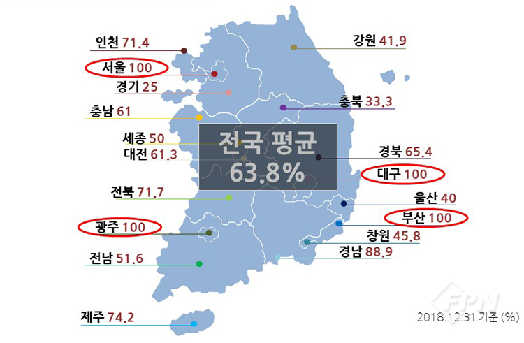 3인 구급대가 100%로 탑승하고 있는 지역은 서울과 부산, 대구, 광주이며 전국적으로 볼 때 3인 구급대 탑승률은 평균 63.8%입니다.