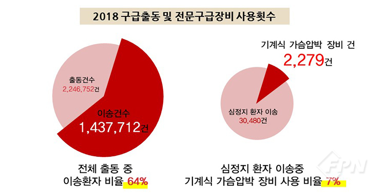 2018년 전국 구급출동 및 전문구급장비(자동 심폐소생술 장치) 사용현황을 살펴보면 총출동 건수는 224만6752건, 이송 건수는 143만7712건으로 전체 출동 중 이송환자의 비율은 64%입니다.