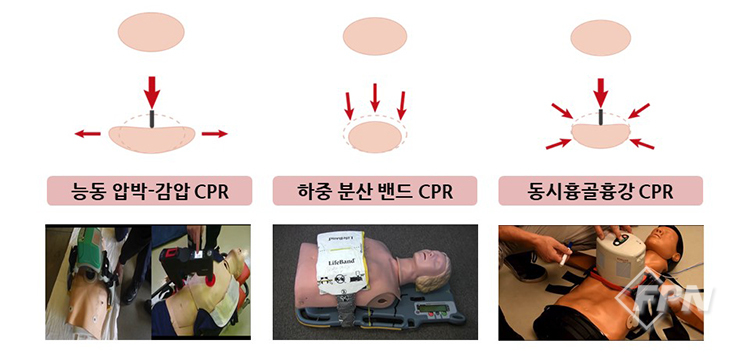 사람이 직접하는 도수심폐소생술은 혈역학적 모니터링에 근거해 최적의 압박위치를 찾아내는 유연함을 갖는다는 장점이 있습니다. 자동심폐소생술 장치의 경우 ▲균일한 강도로 가슴압박 제공 ▲심정지 현장에서 효율적인 인력 배치 가능 ▲이송 중에도 가슴압박 가능 ▲기계 전원이 꺼지지 않는 한 지치지 않음 ▲환자에게 다른 처치를 할 수 있음 ▲심정전기 충전 중에도 가슴압박이 가능함 등 여러 장점이 있습니다.
