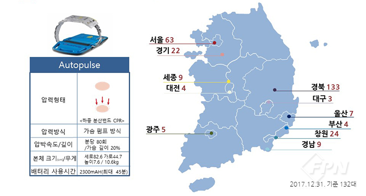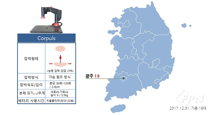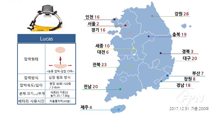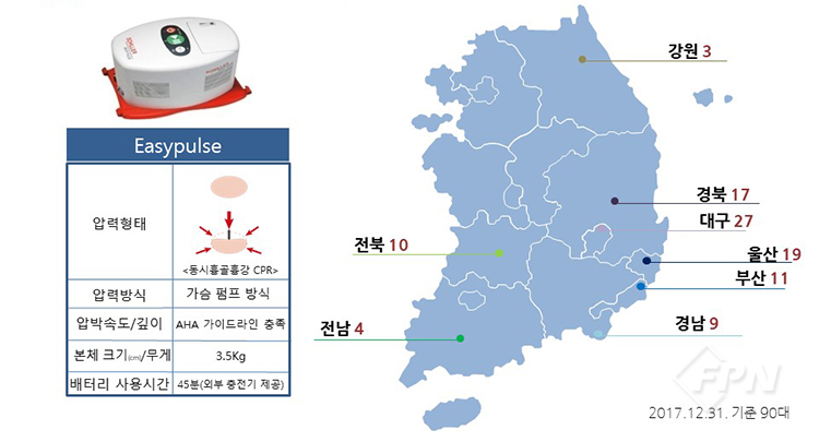 압력형태는 동시흉골흉강 CPR이며 압력방식은 가슴 펌프 방식입니다. 크기와 무게는 네 가지 장비 중 가장 작고 3.5㎏으로 가볍습니다. 2017년 12월 31일 기준 전국에 90대가 보급돼 사용 중입니다.