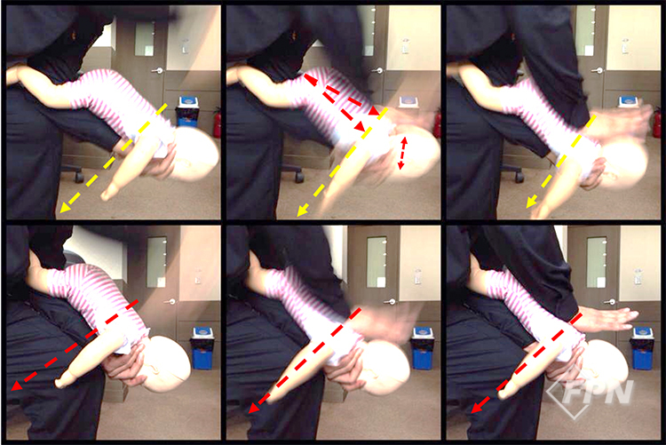 보다 효과적으로 수행하기 위해서는 넓적다리에 영아 가슴이 단단히 고정돼야 하며 타격할 때 영아가 흔들거리게 되면 떨어뜨릴 수 있어 [그림 3]과 같은 방법을 추천한다.