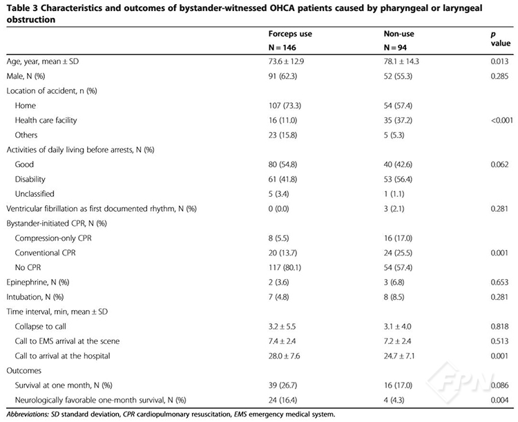 기도폐쇄 심정지 환자의 생존율에 관여하는 요소 이물질 기도폐쇄에 대한 연구가 많지 않지만 ‘Sakai et al. scandinavian journal of trauma, resuscitation et emergency medicine’이라는 학술지에 ‘Effectiveness of prehospital Magil forceps use for OHCA d/t foreign body airway obstruction in Osaka City’ 연구는 다음과 같다.