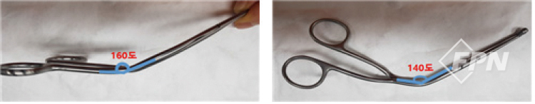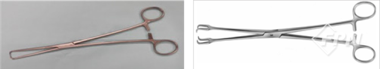 (오른쪽)악어 겸자(alligator forcep) 권총 모양의 겸자로 끝이 악어 머리 모양과 비슷하다고 해서 앨리게이터 포셉이라고 명칭이 붙었다. 얇고 길기 때문에 작은 이물질을 잡는 데 용이하다.