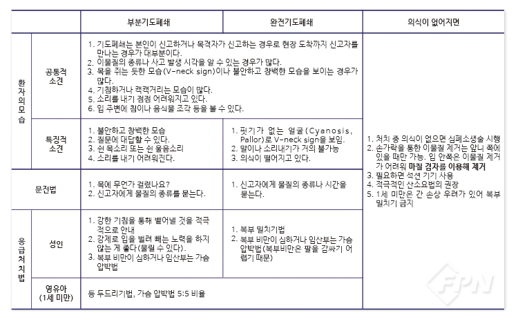 완전기도폐쇄일 경우 의식이 있는 사람에겐 복부 밀치기(하임리히법)를 해 이물질 제거를 시도한다.