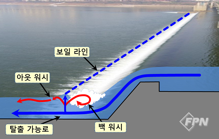 재순환 속에 존재하는 탈출로 수중보에 관한 각종 자료를 보면 대부분에서 탈출로(Escape route 또는 Exit route)가 표시돼 있습니다. 탈출로에 대해선 ‘수중보의 재순환에 잡혔을 때는 수중으로 완전히 가라앉아 재순환이 약해지는 부분을 타고 물 밖으로 나온다’고 설명하고 있습니다. 그런데 과연 수중보의 재순환에 잡혔을 때 저 탈출 가능로를 통해 탈출하는 게 쉬울까요? 결론부터 말씀드리면 “불가능에 가깝다” 입니다.