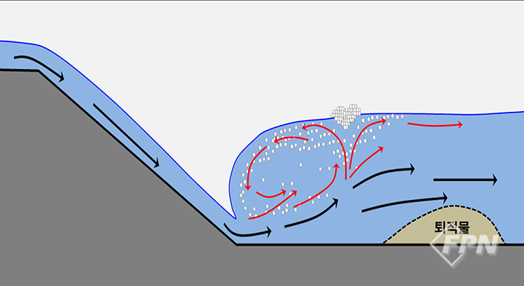 보이지 않는 형태와 그 위험요인 우선 우리가 수중보의 위험성에 대해 교육받을 때 위 또는 다음 쪽의 그림을 통해 재순환과 위험요인을 배웁니다. 보통은 강바닥에서 재순환되지 않는 물을 통해 탈출할 수 있다고 알려줍니다.