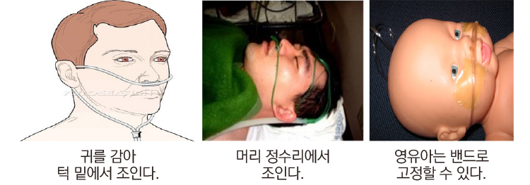 비강 캐뉼러(nasal cannula) 약한 호흡곤란을 호소하는 환자에게 가장 흔히 사용하는 장비로 예방적 차원에서도 사용할 수 있다. 때론 심리적인 지지를 위해 사용하는 경우도 있으므로 참고하기 바란다.
