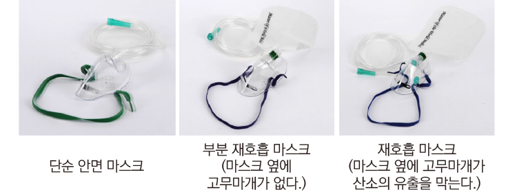 안면 마스크는 세 가지 유형으로 구성된다. 호흡곤란의 중증도에 따라 구분해 사용하므로 구급대원의 임상적 평가가 매우 중요하게 여겨진다. 또 환자 의식이나 호흡곤란의 호소 정도, 얼굴색, 호흡 패턴, 산소포화도 수치 등을 통해 종합적으로 평가돼야 한다.