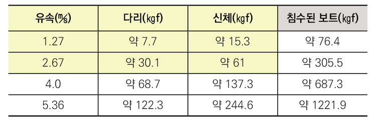 순간적으로 당기는 힘은 0.89kN(약 91㎏f)로 보고 있습니다. 위에 제시한 [표 1]에 따르면 유속이 1.27㎧일 때 신체에 15.3㎏f의 힘이 가해지며 이는 한 명이 버틸 수도 있는 힘입니다.
