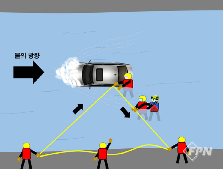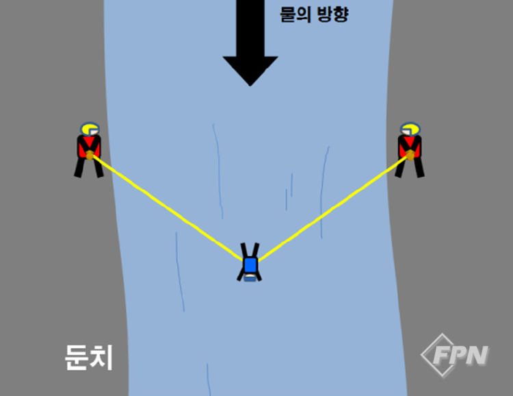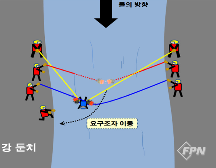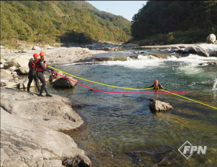 구조대상자용 PFD와 헬멧을 갖고 도착한 대원은 이 장비를 구조대상자에게 착용시킨 뒤 하류 쪽 로프를 잡고 안전지역으로 이동해 구조대상자를 구조합니다. 이 기술의 장점은 일단 한 번 설치하면 같은 작업을 계속해서 반복할 수 있다는 겁니다.