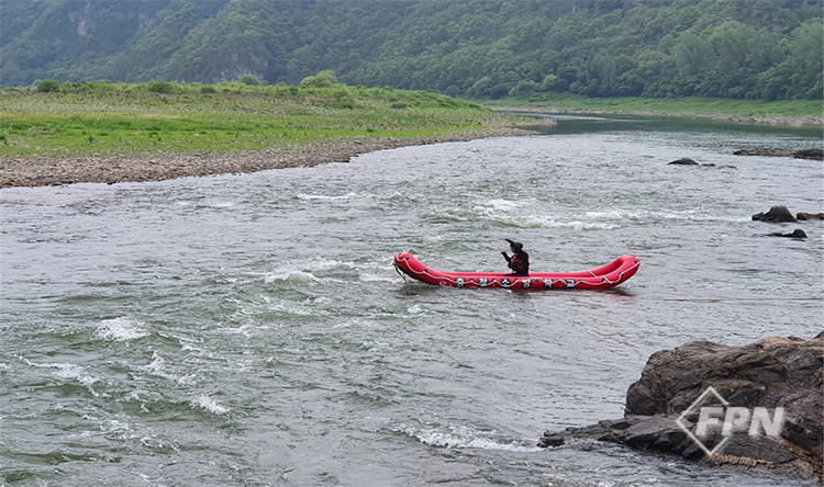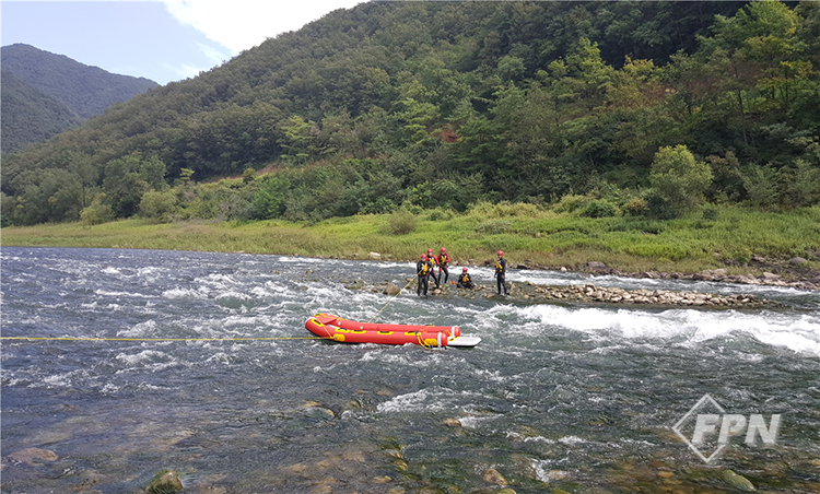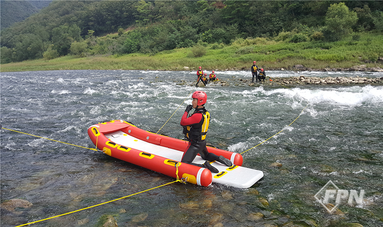 이렇게 선수에 연결된 두 개의 로프를 사용해 급류 위에서 보트를 띄우고 둔치에서 대원들이 보트를 조종합니다. 2-라인 보트는 선수에서만 보트를 조종하기 때문에 상대적으로 유속이 느린 구간에서 사용하는 게 좋습니다.