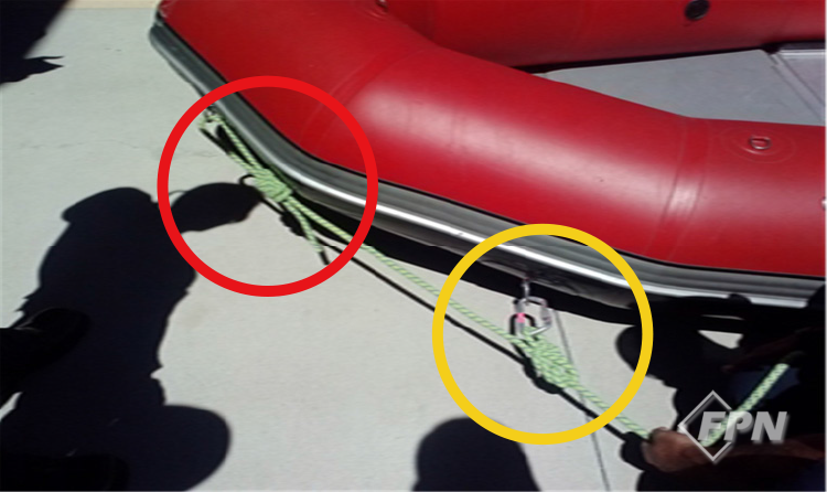 이때 반대편으로 가야 할 선미 로프는 설치만 한 뒤 로프 가방에 넣어 보트 내부에 카라비너로 연결합니다. 그리고 반대편으로 넘어가야 할 추가 인력을 보트에 승선시킨 뒤 보트를 진수합니다.