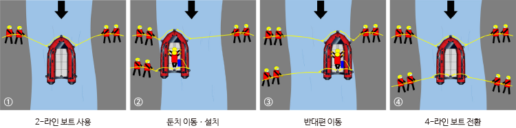 이렇게 되면 보트 진수 위치에선 선수와 선미 로프를, 반대편에서는 선수 로프만을 갖고 보트를 조종하게 됩니다. 보트를 이동시켜 반대편에 도착하면 승선했던 대원들은 로프 가방에 있던 로프를 갖고 내려 4-라인 보트 구성으로 전환해 구조 작전을 진행하면 됩니다.