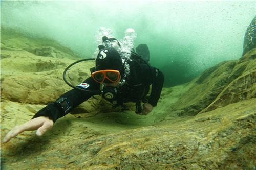 수색을 마치고 밖으로 나올 때도 [사진 2]와 같이 바닥에 몸을 최대한 붙여야 한다. 오리발을 힘껏 차면서 추진력을 최대로 해줘야 한다. 핀 킥(fin kick)만으로는 빠져나오기가 쉽지 않을 수 있으므로 바닥에 잡을 수 있는 곳을 찾아 잡아당기면서 나와야 한다.