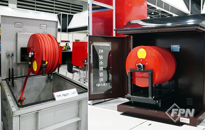 이번 전시회에선 설치 대상물 특성에 맞춰 개발한 기존 비상소화장치에 더해 바닥에 매립된 형태로 사용하는 ‘매립형’과 호스 전개 걱정이 없는 ‘슬라이딩형’ 등 두 가지 제품을 선보였다.