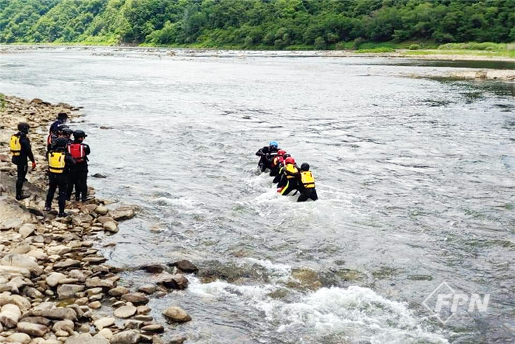 또 대형을 유지하고 이동하기 위해 내 동료와 내 두 다리가 세 개의 지지점을 유지하면서 이동하면 수중 바닥에서 발생할 수 있는 발이 끼이는 상황에 대비할 수 있도록 훈련돼 있어야 합니다. 마지막으로 얕은 물 건너기를 하는 대원을 위해 대원의 수보다 더 많은 수의 하류 안전 대원들이 배치돼야 합니다.