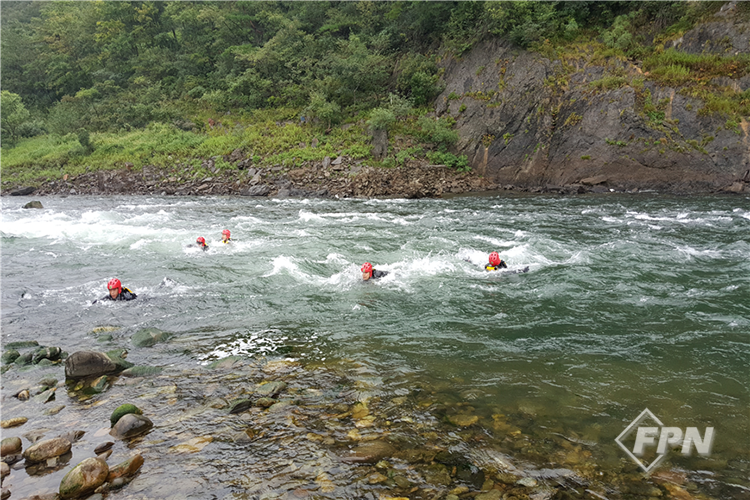 그 이유는 팀장이 서 있는 위치부터 작은 에디가 만들어져 다른 대원들이 건너는 걸 조금 더 수월하게 해 주기 때문입니다. 팀장은 하류 쪽을 바라보고 대원 전체의 움직임을 파악하면서 이동 속도를 조절합니다. 다른 대원들은 상류를 보고 서로를 상류 쪽으로 밀어주듯이 자세를 잡습니다.