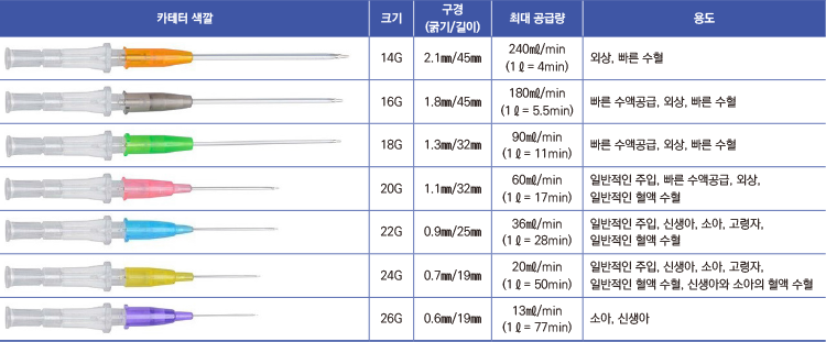 하지만 저혈당과 심혈관 질환, 소아 환자들은 18G 이하의 혈관으로도 충분하다. 카테터 크기별 용도와 분당 최대 공급량 표를 알고 있으면 큰 도움이 된다.