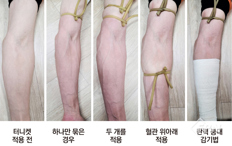 에스마르흐 붕대는 이젠 상품화된 고무밴드다. 실제 현장에서는 기존의 고무 터니켓을 이용해도 충분한 효과를 볼 수 있는 듯하다.