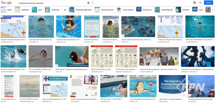 또 물 위로 얼굴을 띄우기 위해 손으로 이리저리 물을 누르려는 동작을 보입니다. 이런 반응은 사람의 본능적인 행동이며 이를 본능적 익수 반응(Instinctive drowning response)이라고 합니다. 이런 모습으로 인해 종종 구조대상자가 물에서 놀고 있다는 오해를 불러일으킬 수 있습니다.
