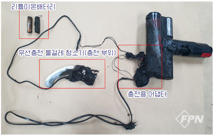 이로 인해 배터리 열 폭주나 화재 발생 가능성이 커집니다. 실제 가정에서 사용하는 무선청소기에 고출력의 어댑터로 충전해 화재가 발생한 적도 있습니다([그림 2] 참조).