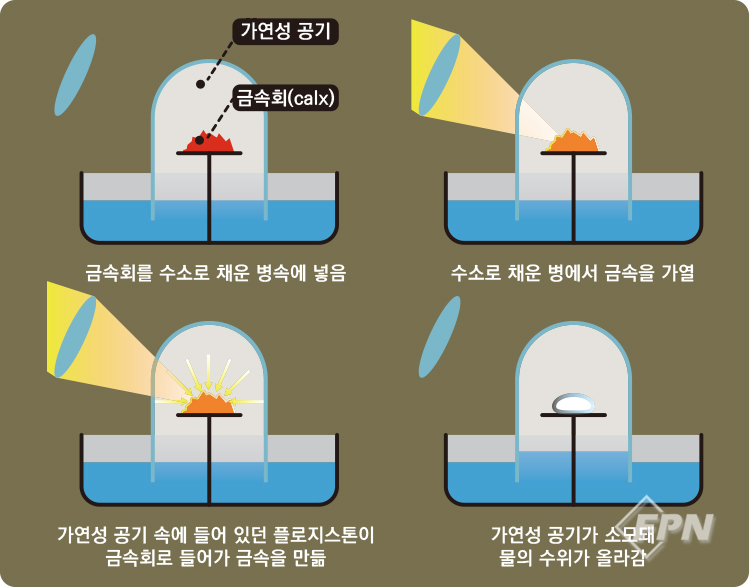 만약 플로지스톤이 빠져나가는 거라면 무게가 늘어날리 없다고 생각한 그는 다양한 실험을 계속했다. 금속과 인, 유황을 모두 태워봤는데 역시 질량이 늘어나는 걸 확인했다. 어떤 물질이 탈 때 질량이 늘어난다면 무언가가 빠져나가는 게 아니라 더해지는 거다.