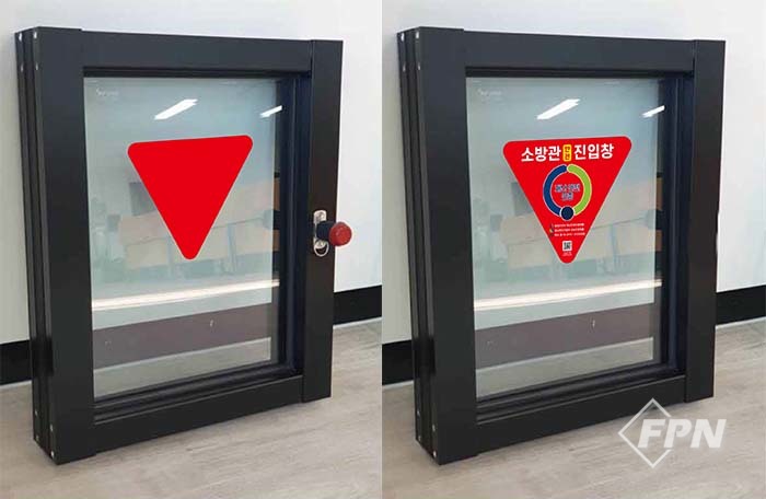 유리 파괴도 간편하다. 이 진입창의 창틀이나 복층유리에 적용된 크러쉬 버튼만 누르면 누구든지 손쉽게 유리를 깨뜨릴 수 있다. 망치 등 별도 도구가 필요 없는 셈이다. 이 진입창 중간엔 지름 20㎝ 이상의 붉은색 빛 반사 역삼각형 필름이 부착돼 밤에도 알아보기 쉽다.