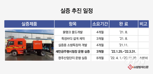 이번 실증에선 소방 주력 차량인 5t 소방펌프차에 장착된 합성수지탱크(용량 3천ℓ)를 3400ℓ 용량으로 제작해 화재 진압 활용 가능성을 검증한다.