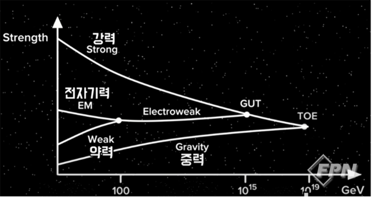 원래 하나던 힘이 네 가지 힘으로 분리됐다. 과학자들은 자연계에서 원래 하나인 힘인데 이를 관찰하는 세계에서는 사이즈에 따라서 네 가지 힘으로 분리된다는 걸 못마땅해했다.