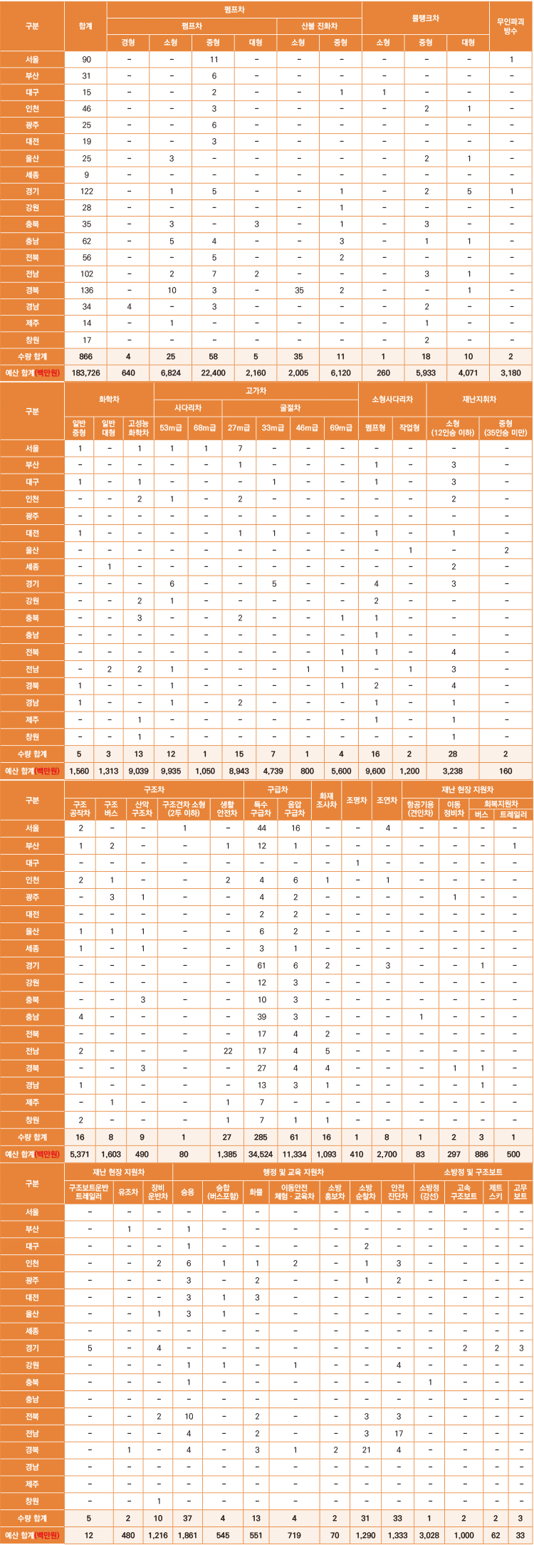 서울은 중형 11대, 부산은 중형 6대, 대구는 중형 2대와 산불진화차 중형 1대, 광주는 중형 6대, 대전은 중형 3대, 울산은 소형 3대, 경기는 소형 1대, 중형 5대, 산불진화차 중형 1대를 확충한다.