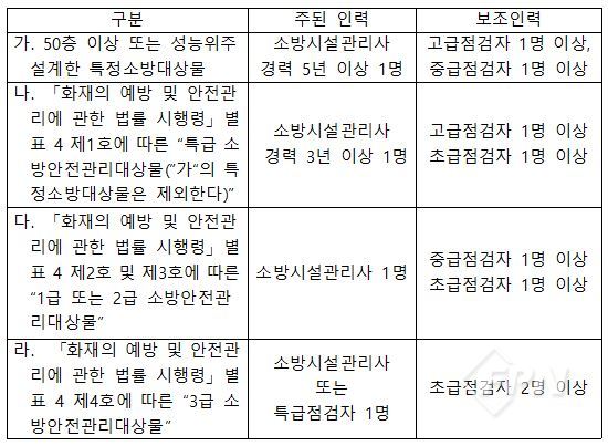 라. 소방안전관리 업무 대행인력의 배치기준․자격 및 방법 등 준수사항을 정함(안 제12조, 별표 1) 1) 現 「화재예방, 소방시설 설치․유지 및 안전관리에 관한 법률」에서 관계인이 소방안전관리자의 자격이 없는 경우 소방시설관리업자로 하여금 업무대행을 할 수 있도록 하고 있으나, 이에 대한 배치기준․자격 및 방법 등 준수사항을 정하고 있지 않아 소방시설관리업자가 임의대로 소방안전관리 업무대행을 수행하고 있음