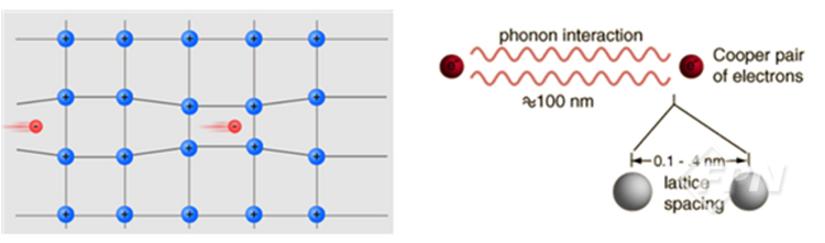 두 개의 전자 사이는 척력이 발생하지만 온도를 충분히 내리면 [그림 3]처럼 인력이 발생한다. 음전하를 띤 전자가 양전자를 통해 양이온 격자 사이를 지나가면 전자와 인력이 작용해 그 방향으로 움직인다.