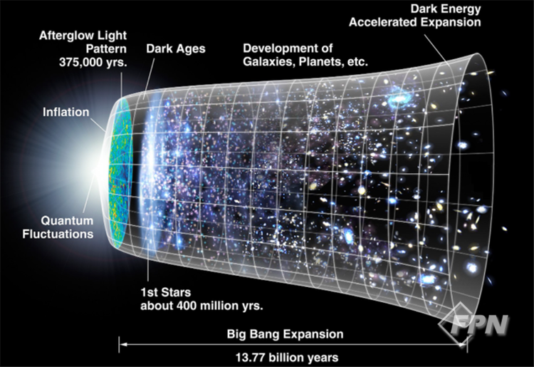 처음에 만들어진 우주는 지금처럼 크지 않았다. 좁은 공간에 모든 물질과 에너지가 몰려 있으므로 우주 공간은 초밀도, 초고온, 초고에너지 상태였다. 빅뱅 38만년 뒤 우주가 팽창하며 온도가 낮아지기 시작한다.