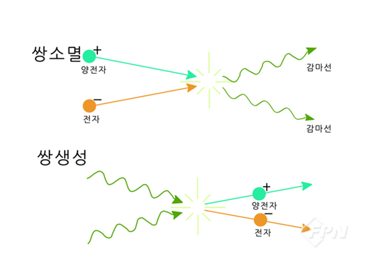 반면 반물질은 반양성자와 반중성자 그리고 양전자로 구성된다. 지금으로부터 137억년 전 시간도 공간도 없는 우주엔 태초에 빛이 있었다. 그리고 그 빛에 의한 쌍생성을 통해 우주가 만들어졌다.