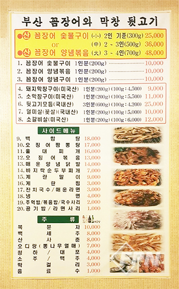 부산꼼장어의 메뉴는 정말 다양하다. 하지만 늘 내 픽은 산꼼장어 숯불구이나 뒷고기 모듬이다.
