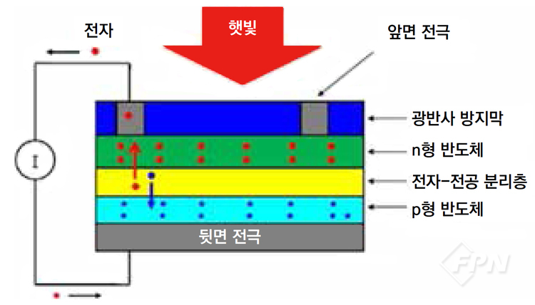 빛이 태양광 패널에 부딪히면 광전효과가 일어나면서 전자가 방출되고 정공(전자가 방출된 빈자리)이 생긴다. 태양광 패널의 전자는 N형 반도체로 흐르고 정공은 P형 반도체 쪽으로 흐르도록 접합돼 있다.