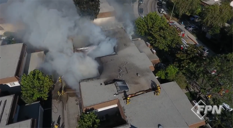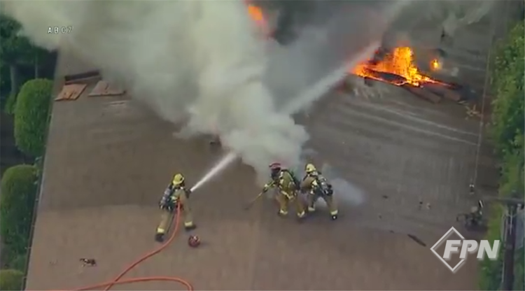 지붕 위 3명은 동력절단기와 엔진톱을 이용해 지붕을 잘라내고 있다. 잘라낸 지붕은 열기의 퇴출로로 이용된다. 2층에서는 선상에서 화세를 수세로 밀어내고 있기 때문에 화세는 반대 방향으로 계속해서 밀리게 된다.