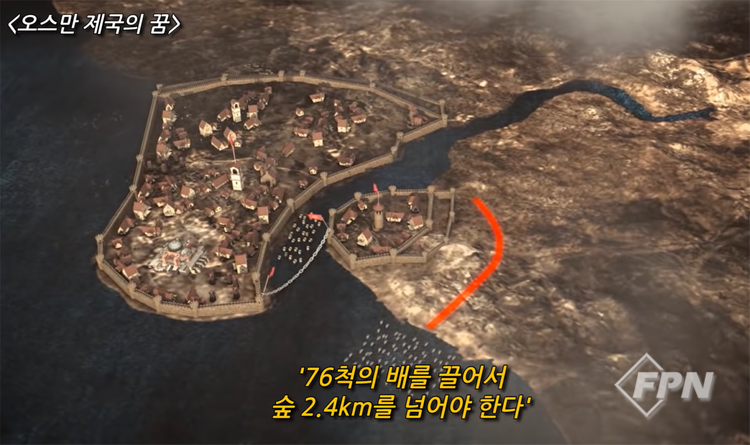 그러나 오스만제국 불세출의 영웅 메흐메드 2세는 이 쇠사슬을 넘지 않고 배로 육로를 이용해 금각만 내부에 진입하는 전격전을 단 하룻밤 만에 성공시킨다.