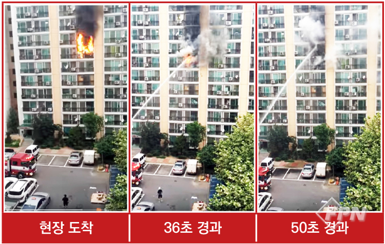 강남 아파트 화재 현장지휘관의 판단 아래 사진은 2016년 7월 11일 강남구 대치아파트 화재 현장이다. 주민이 촬영한 영상을 유튜브에서 발췌했다. 영상 속 선착 펌프차와 탱크차가 도착했을 때 화재는 7층에서 최성기로 출화 중이었다.