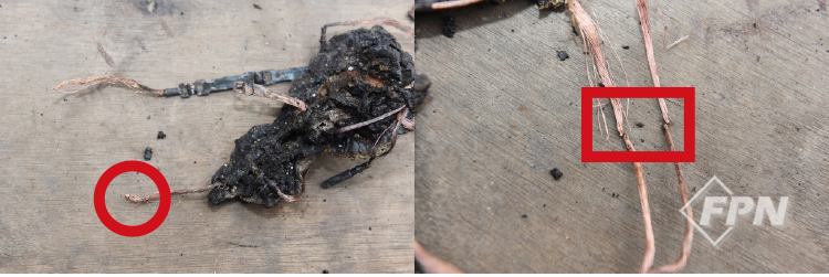 공장 차단기 2개가 트립돼 있으며 한쪽 차단기에는 전선 1개가 이탈된 상태로 잔류해 있다. 3상 전선이 연결된 차단기도 트립된 상태였다. 공장 사무실로 추정되는 부분의 냉온수기가 설치된 지점 전선에서 단락 흔적으로 식별되는 용융 흔적이 관찰된 점으로 전기적 요인의 가능성이 크다고 판단했다.