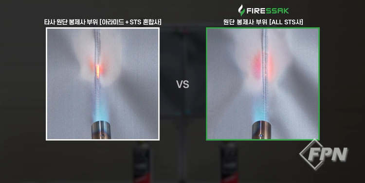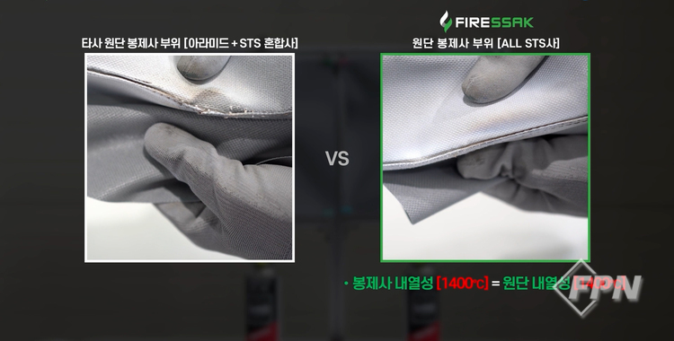 또 “타사의 경우 아라미드 봉제사를 사용하는 경우가 많다”며 “아라미드사는 내열성이 약 500℃에 불과해 전기차 화재대응 시 손상 우려가 크다”고 설명했다.