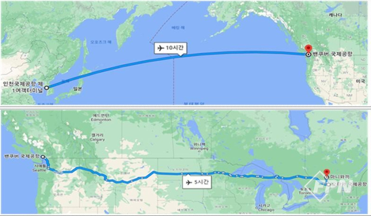 약 10시간 비행을 마친 후 밴쿠버 공항에서 2시간 정도 급유를 하고 다시 동쪽 오타와공항으로 5시간을 더 이동하는 장장 18시간의 비행이었어.