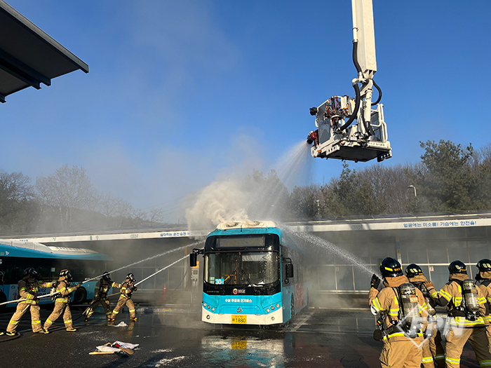 ![]() ▲ 소방관들이 경기 수원시 장안구 공영버스 차고지에서 발생한 전기버스 화재를 진압하고 있다. ©수원소방서 제공 |