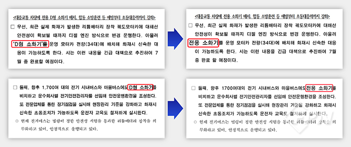 ![]() ▲ 서울시가 배포한 보도자료에 있던 ‘D급 소화기’ 문구를 어느샌가 ‘전용 소화기’라고 고친 것으로 확인된다. © FPN |