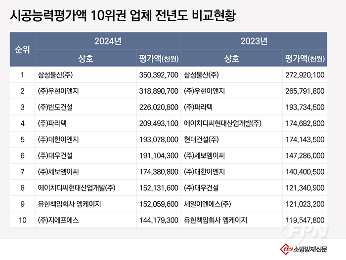 삼성물산(주), 4년 연속 소방시설공사 시공능력평가 1위2위 (주)우현이앤지, 3위 (주)반도건설… 실적 총액 9조528억원으로 역대 최고