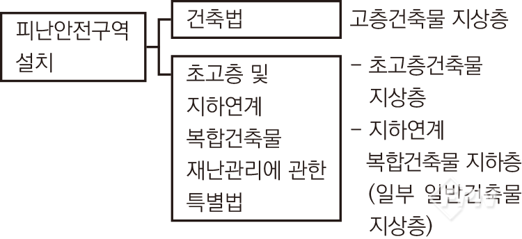 앞서 언급한 바와 같이 피난안전구역은 ‘건축법’상 ‘고층건축물’에 설치해야 한다. ‘초고층 및 지하연계 복합건축물 재난관리에 관한 특별법’에서 규정하는 ‘지하연계 복합건축물’에도 피난안전구역을 설치하도록 규정하고 있다.