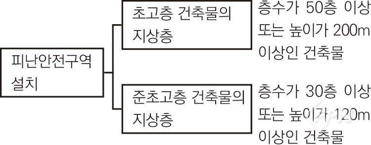 ‘준초고층 건축물의 피난안전구역’은 이와는 다른 개념으로 피난안전구역을 1개소 이상만 무조건 설치하면 된다. 이는 개수뿐 아니라 설치 위치까지 규정한 것이다.