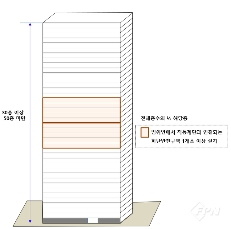 직통계단과 직접 연결되는 피난안전구역을 해당 건축물 전체 층수의 2분의 1에 해당하는 층으로부터 상하 5개층 이내에 1개소 이상 설치하여야 한다.