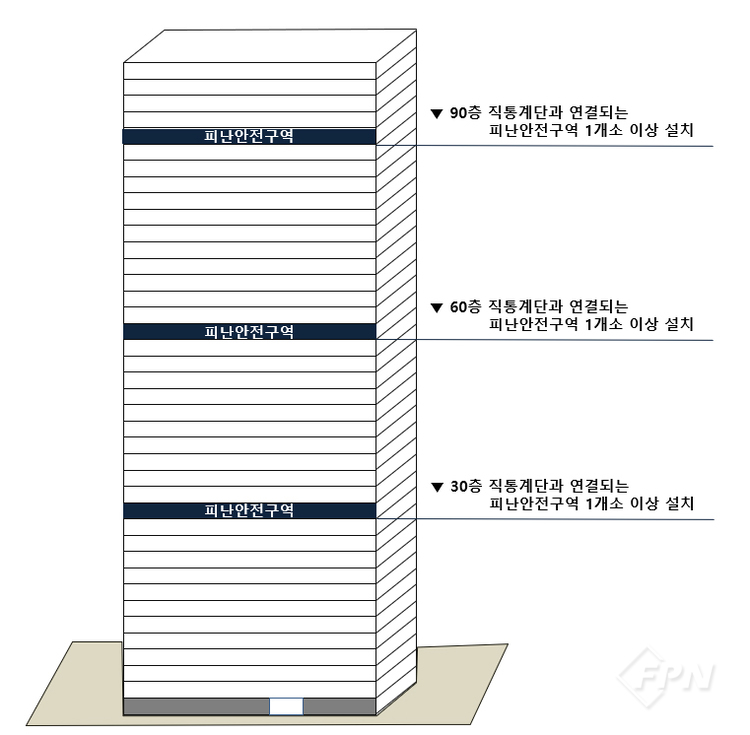 ‘초고층 건축물의 피난안전구역’은 30개층 마다 1개소씩 설치해야 한다. 이는 단순히 30층마다 설치하라는 설치 위치의 규정이 아니라 설치 개수의 기준이라고 보면 된다. 즉 층수가 30층에서 59층까지의 건축물에는 1개소, 60층에서 89층까지는 2개소, 90층에서 119층까지는 3개소 등을 설치하라는 개념이다.