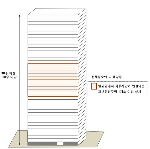 피난층 또는 지상으로 통하는 직통계단과 직접 연결되는 피난안전구역을 지상층으로부터 최대 30개 층마다 1개소 이상 설치하여야 한다. |